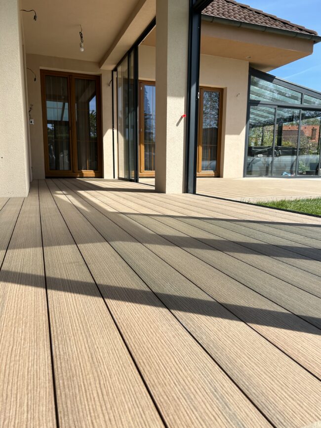Kompozitní terasa v zahradě rodinného domu s bazénem.