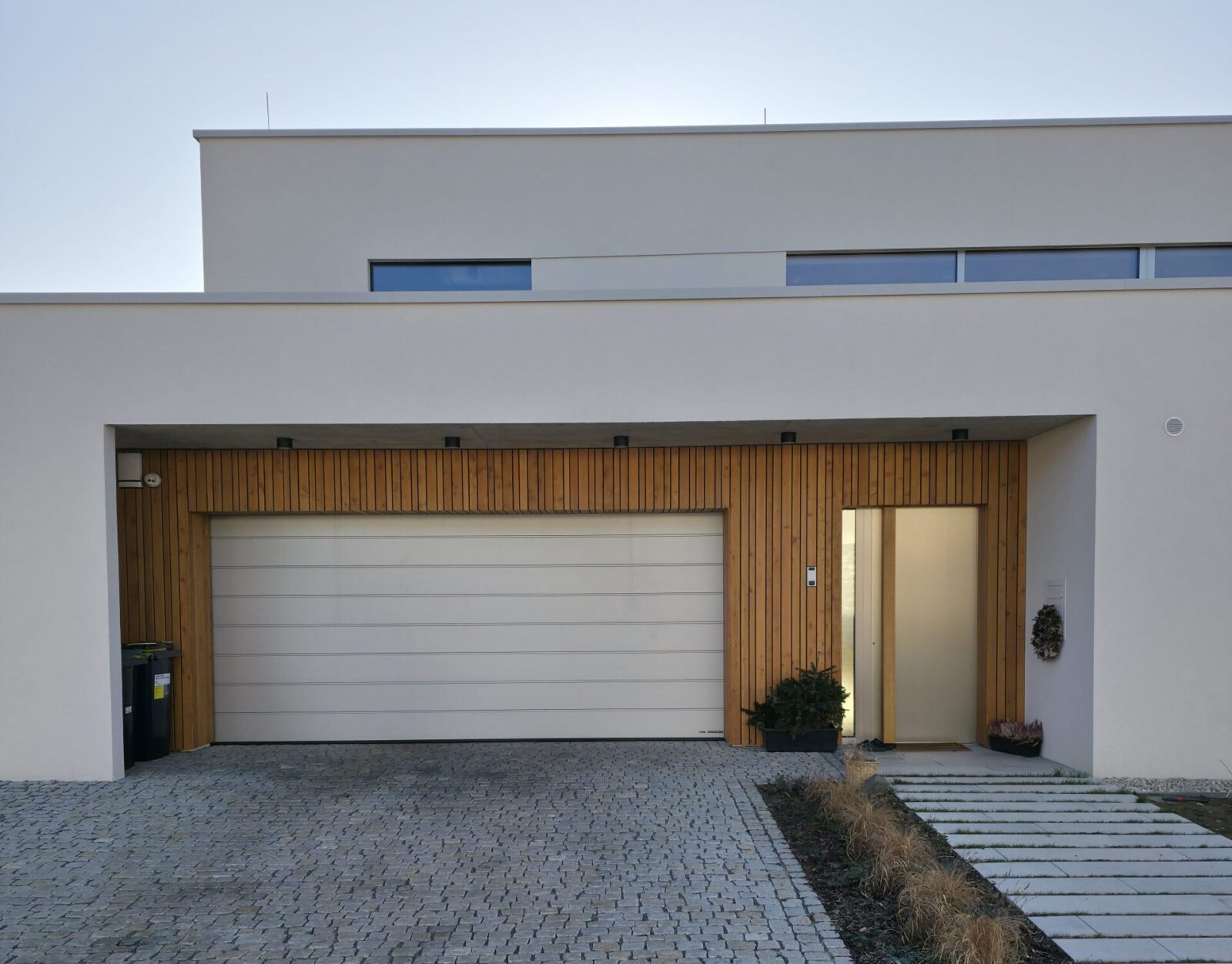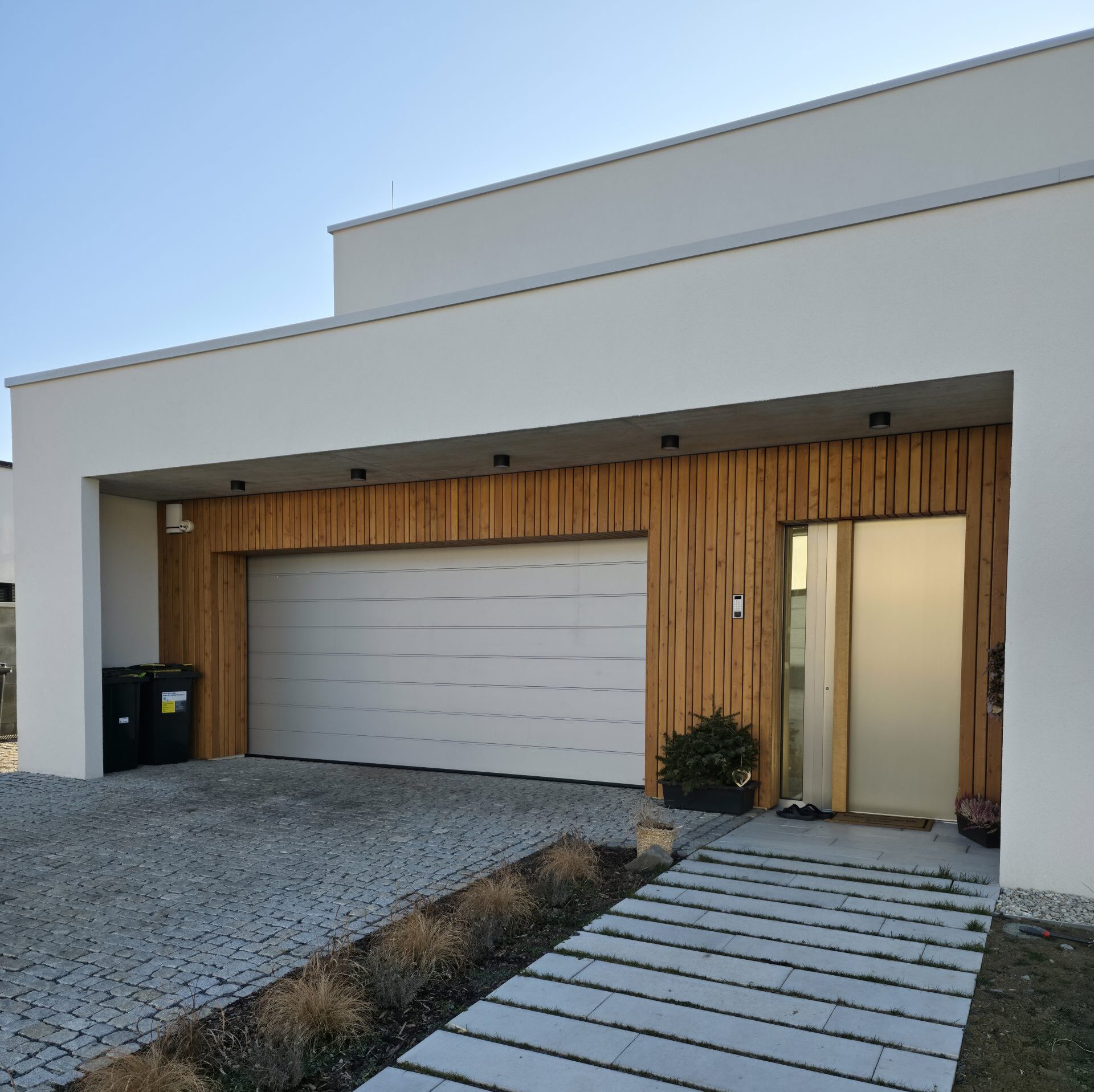 Na této realizaci jsme pro vytvoření fasádního obkladu použili klasická terasová prkna, která jsme formátovali na šířky 50; 70 a 90mm. Následně jsme takto připravená prkna montovali ve svislé poloze. Výsledek posuďte sami.