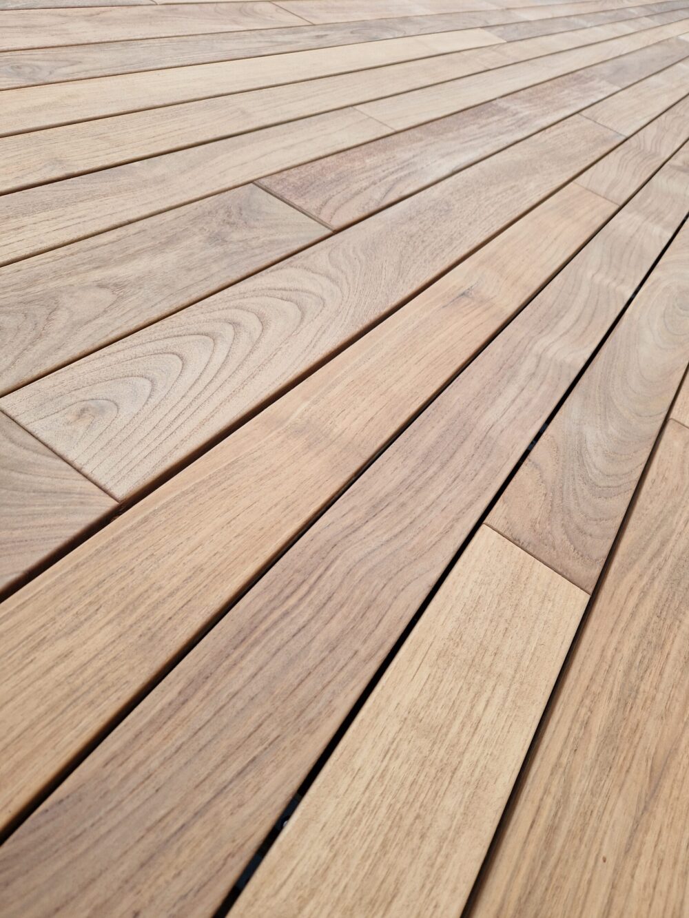 Teak Barmský jednoznačně patří mezi nejlepší materiály pro stavbu dřevěné terasy. Dokonalý vzhled prken u této realizace podtrhuje montáž na skryté kotevní prvky. Při této realizaci byli použity a náhodně kombinované různé délky i šířky prken které tvoří velice povedený a nevšední vzhled terasy.